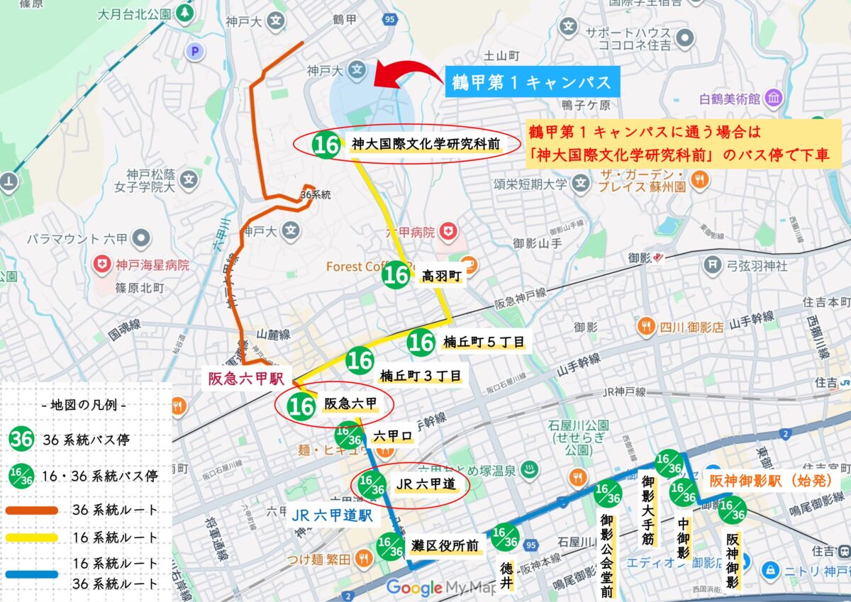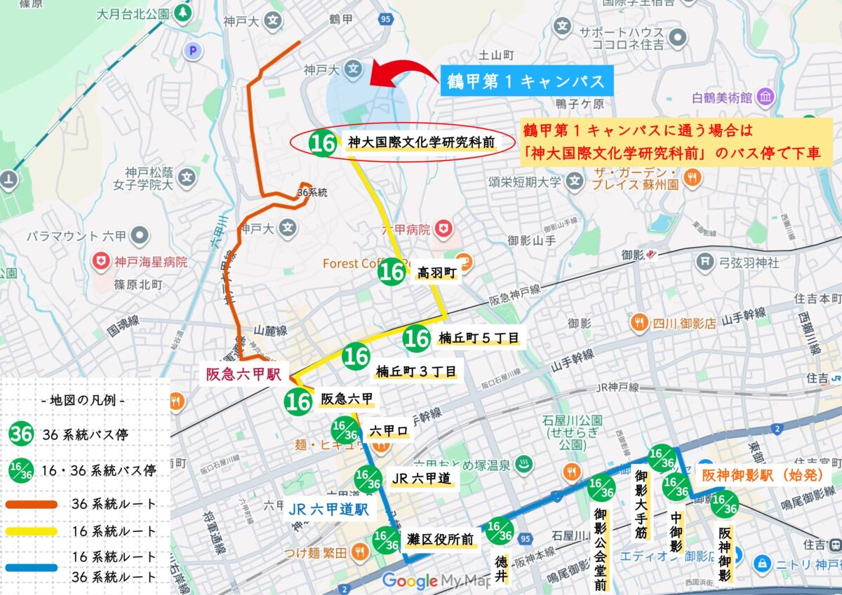 鶴甲第1キャンパスへバスで通う場合は、神戸市バス16系統を利用します。