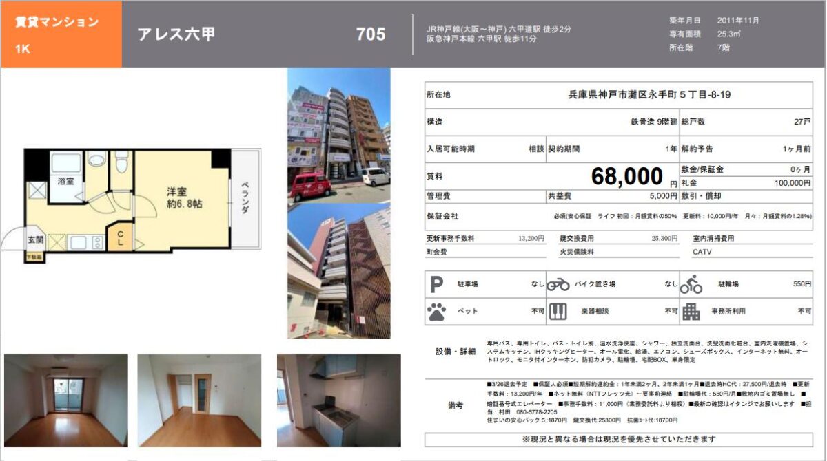 705 7階 68,000 5,000 1K 25.3㎡ - / 100,000円 詳細