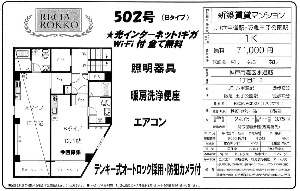 5階 | 71,000円 | 6,000円 | 1R | 29.75㎡ | - / - | 詳細 |