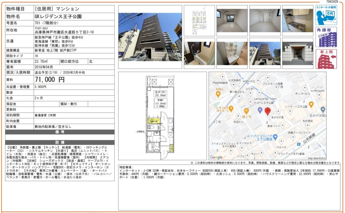 7階 | 69,000円 | 5,000円 | 1K | 23.78㎡ | - / 2ヶ月 | 詳細 |