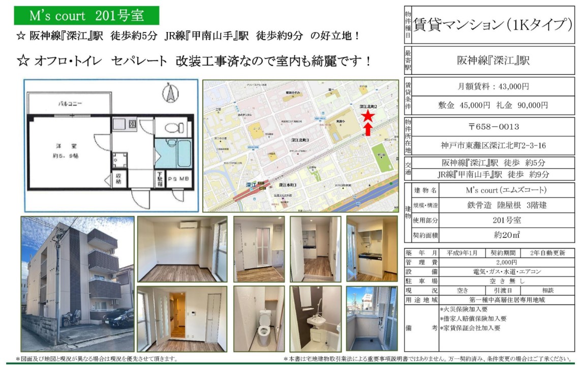 201 2階 43,000 2,000 1K 20㎡ 45,000円 / 90,000円 詳細