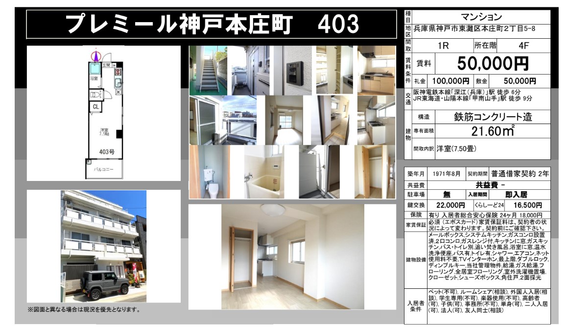 4階 | 50,000円 | --- | 1R | 21.6㎡ | 50,000円 / 100,000円 | 詳細 |
