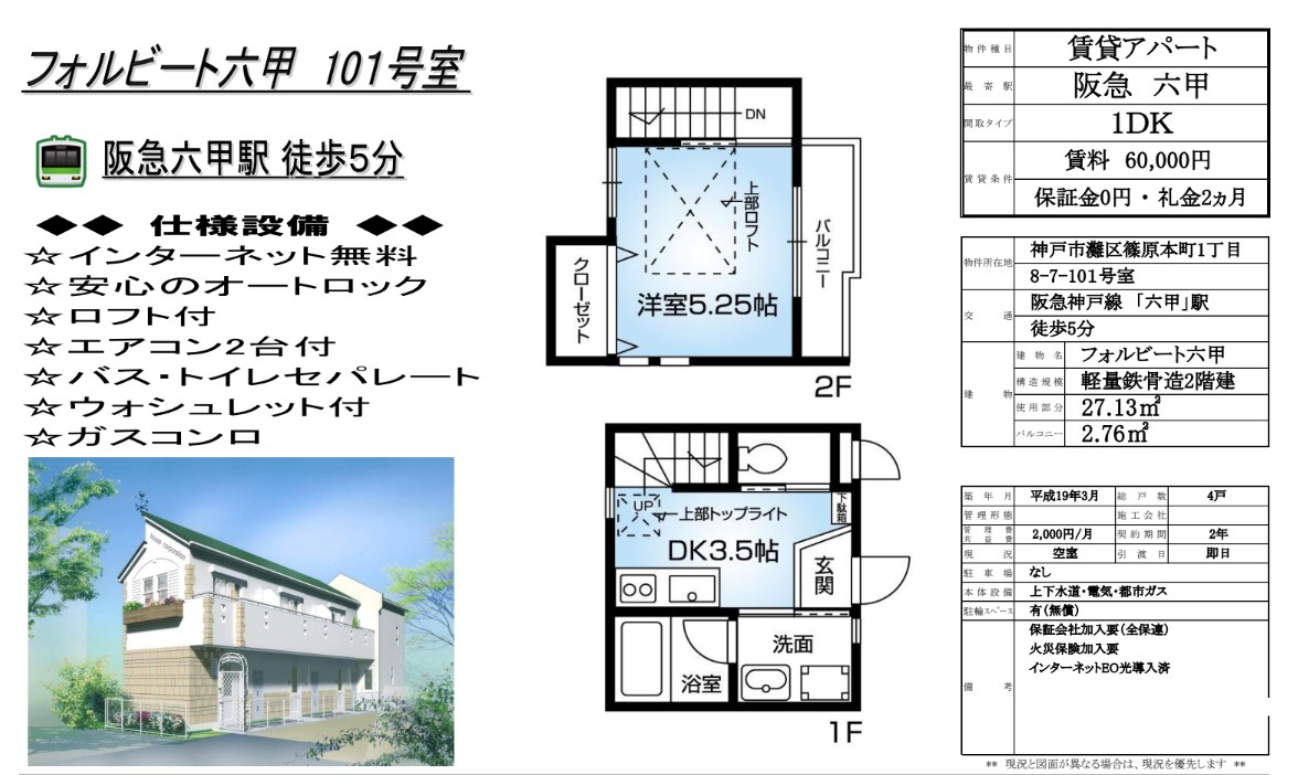 1階 | 60,000円 | 2,000円 | 1DK | 27.13㎡ | - / 2ヶ月 | 詳細 |