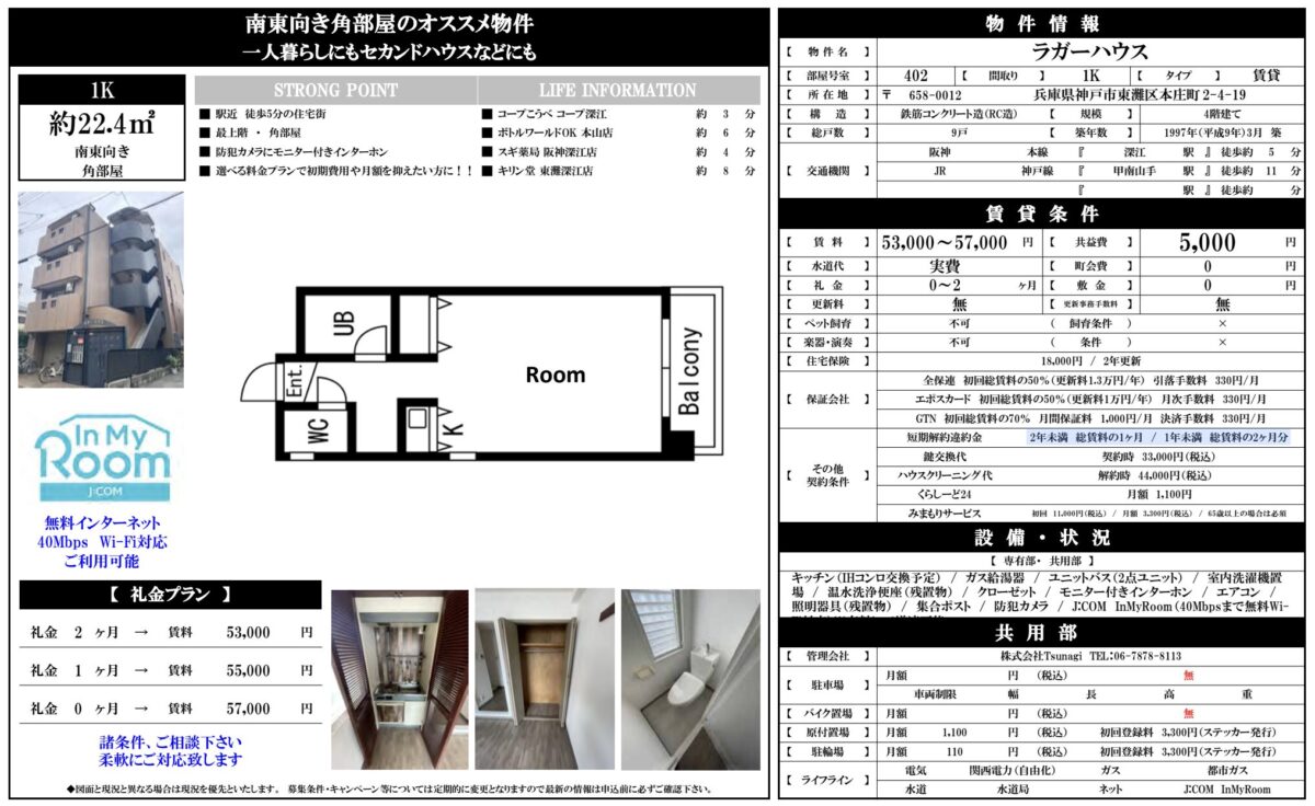 402 4階 53,000 5,000 1K 22.4㎡ - / 2ヶ月 詳細