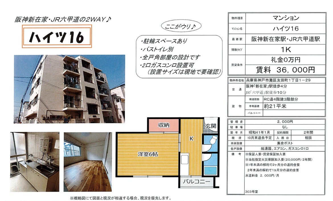 303 3階 36,000 2,000 1K 21㎡ - / - 詳細