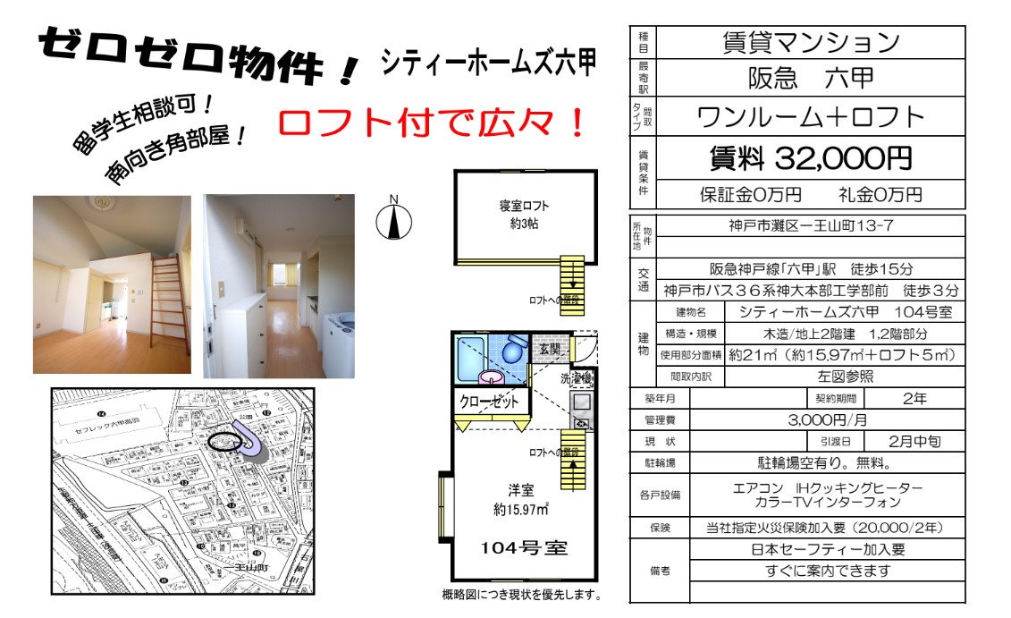 徒歩6分で16系統「高羽町」→「鶴甲南」下車(バス乗車3分)下車後、徒歩7分でキャンパス