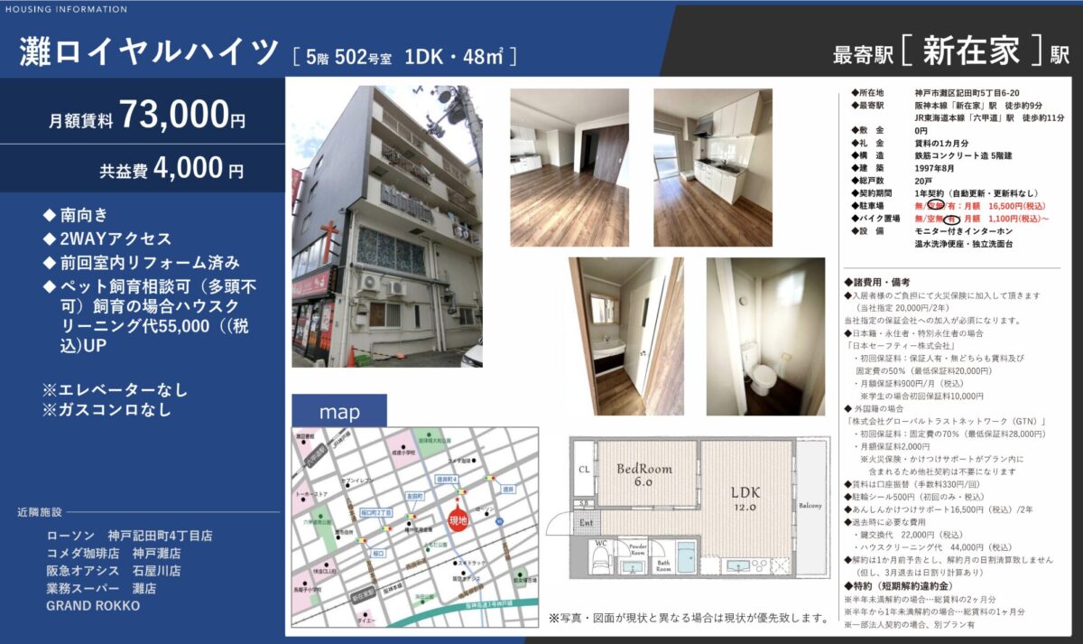 502 5階 73,000 4,000 1DK 48㎡ - / 1ヶ月 詳細