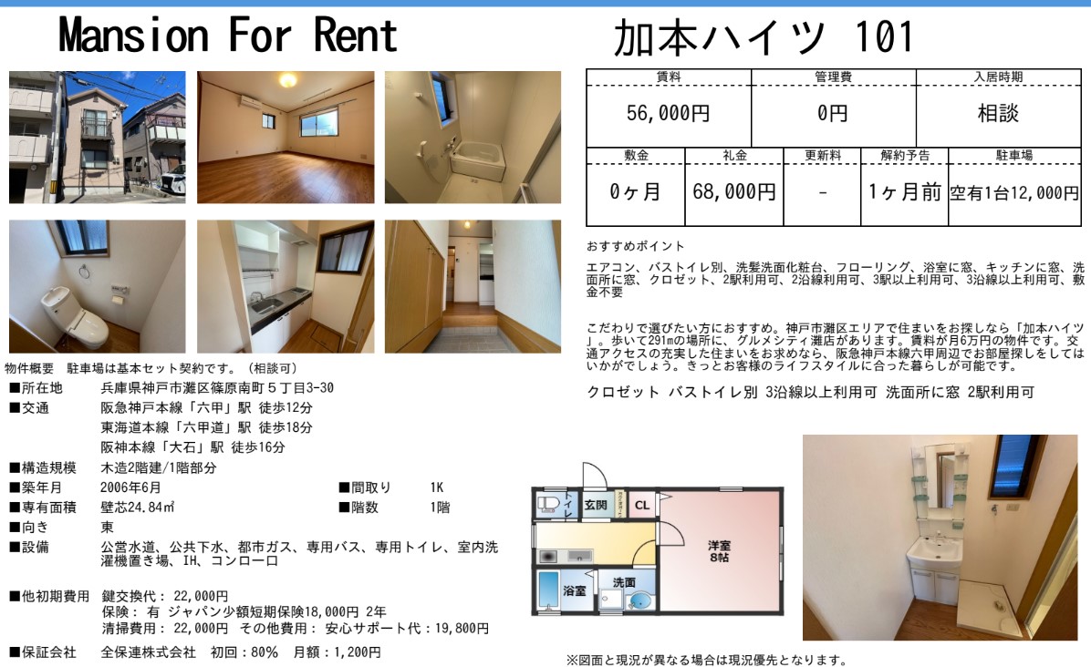 101 1階 56,000 --- 1K 24.84㎡ - / 68,000円 詳細