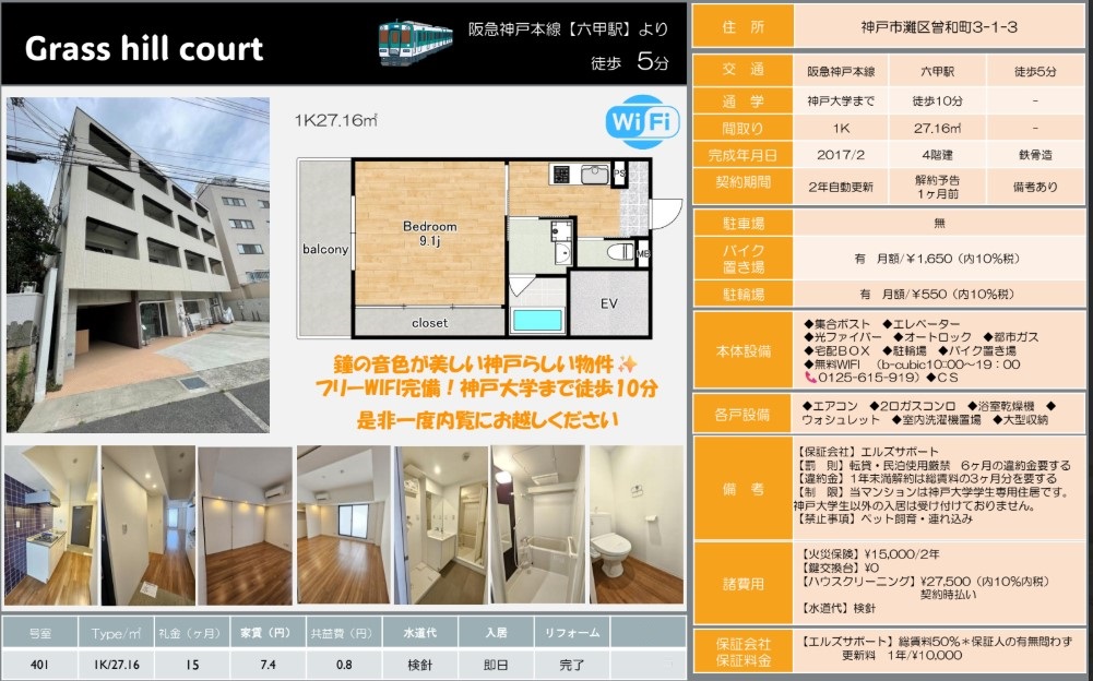 徒歩2分で阪急「王子公園駅」→阪急「六甲駅」下車(乗車時間2分) 36系統乗換え「阪急六甲」→「神大正門前」下車(バス乗車7分)
