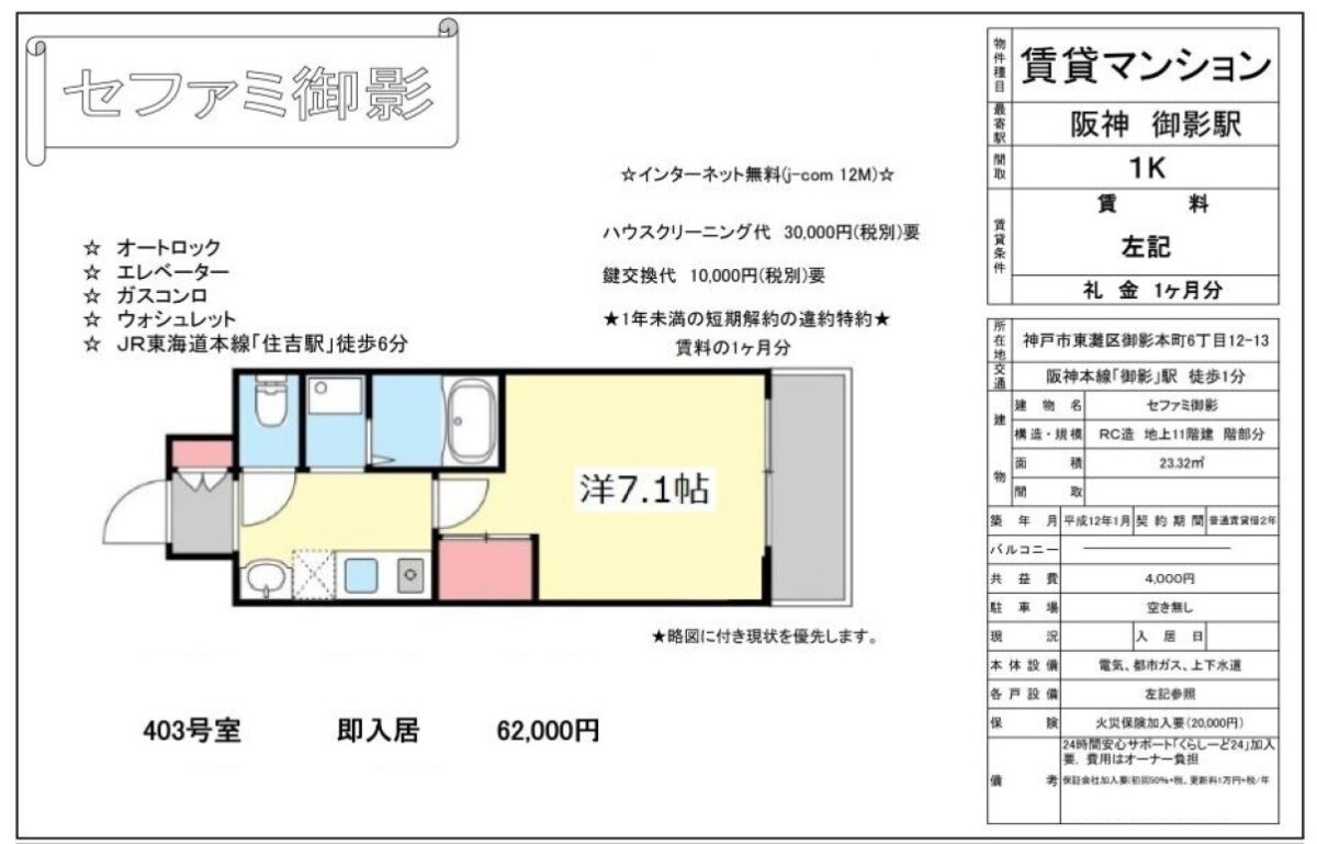 4階 408 5.2万円 6,000円 1K 23㎡ 60,000円 /